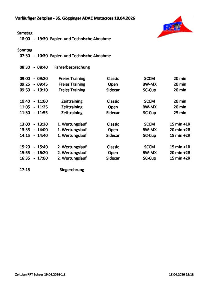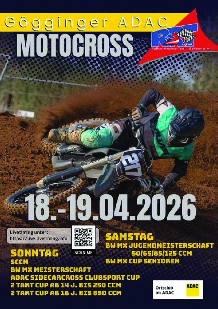 Für eine Podiumsplatzierung ist beim Motocross auch ein guter Start wichtig. Dieses Jahr wird eine breitere Startgerade sowie das neue Streckenlayout für noch mehr Spannung sorgen. Am Wochenende des 18. und 19. April lädt das Rallye-Racing-Team Scheer wieder zum Motocross auf der Naturstrecke oberhalb von Krauchenwies-Göggingen ein. Besonders ist dieses Jahr, dass die Fahrtrichtung geändert wurde. Durch die Umstellung erhält die Strecke einen neuen Charakter. Die Sprünge sowie Kurven erfordern eine neue Spurenwahl von den Fahrer/innen ab. Hier wird sich zeigen, wer mit den neuen Gegebenheiten am besten zurecht kommt und den Rennsieg einfahren kann. Der Samstag steht im Zeichen des Nachwuchses und so sind alle Klassen der Baden-Württembergischen Jugend-Motocross-Meisterschaft, sowie Senioren des BW-MX-Cup zu Gast. Für Sonntag gibt die BW-MX-Meisterschaft Pokal Open, die Classic-Solo Motorräder der SCCM-Serie, sowie die Seitenwagen des ADAC-Sidecar-Cups ihr „Stell-dich-ein“. Das Starterfeld wird sicherlich von den Vereinsfahrern der stetig wachsenden Kinder- und Jugendabteilung des RRT bereichert. Es starten in den Klassen 50ccm Matteo Karrer, Fabian Stärk und Samu Deschler, bei den 65ccm David Stärk, bei den 125ccm Marlon Karrer und bei den Senioren Markus Sendner. Am Sonntag sind im Pokal Open Nico Baumgärtner, Julian Schuller und Marcel Rauser sowie bei den Classic Solo Hendrik Halder am Start. Für das leibliche Wohl ist an beiden Tages bestens gesorgt. Beginn ist am Samstag um 08:00 Uhr mit den Trainingsläufen, das erste Rennen beginnt um 11:40 Uhr. Am Sonntag ist der Veranstaltungsbeginn um 09:00 Uhr mit den Trainings- und ab 13.00 Uhr mit den Rennläufen. Eintritt am Samstag frei, am Sonntag 5€ für Besucher/innen ab 16 Jahren.